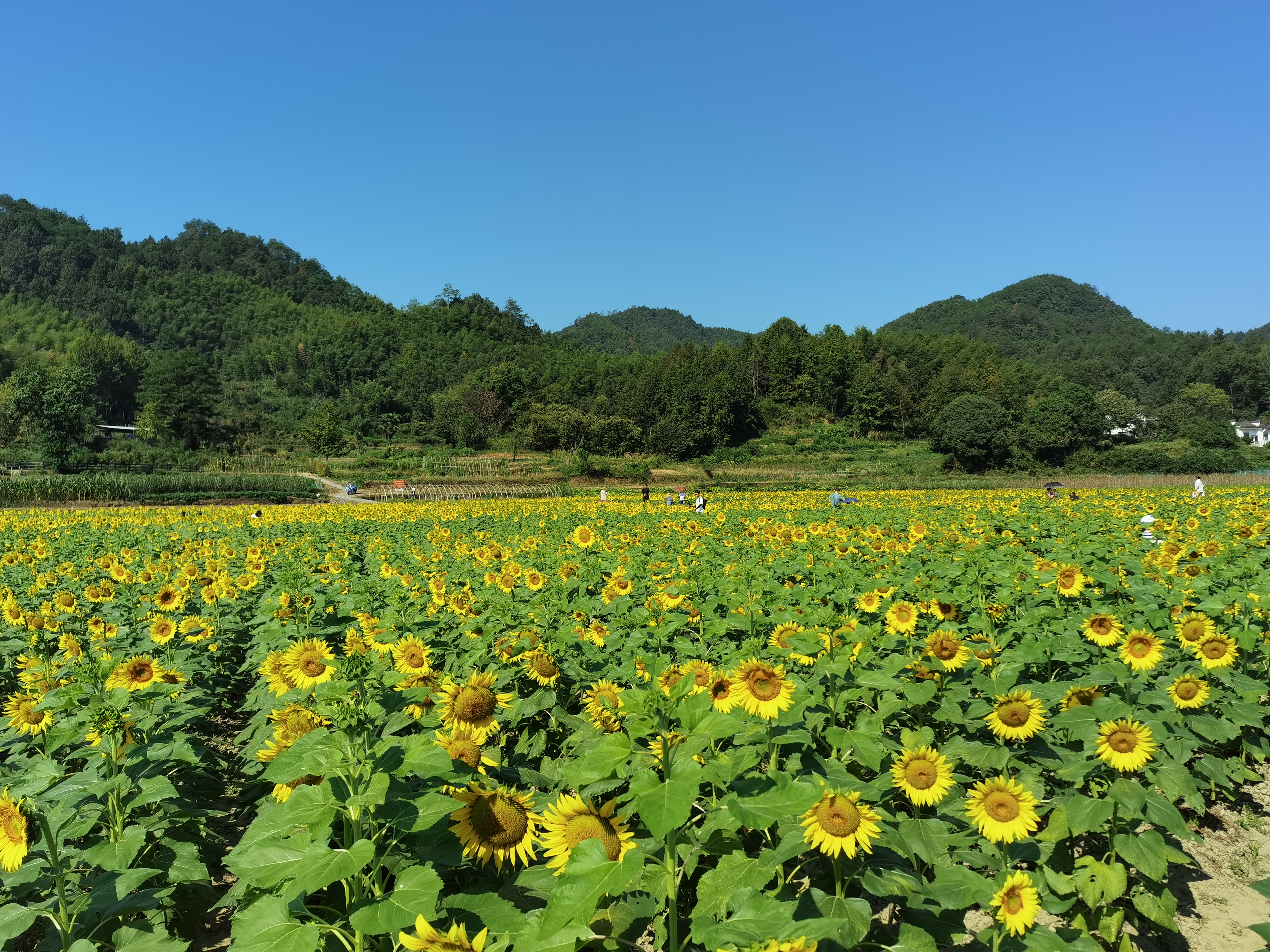 走進花海,綠油油的大葉子襯托著金黃的“臉頰”,在一片清淡的藍天背景上,與周圍的牌坊、石橋、古亭融為一體,呈現出一幅徽州特色的秋日山水畫卷。據悉,該批向日葵於7月底播種,盛開時適逢中秋、國慶等節假日。