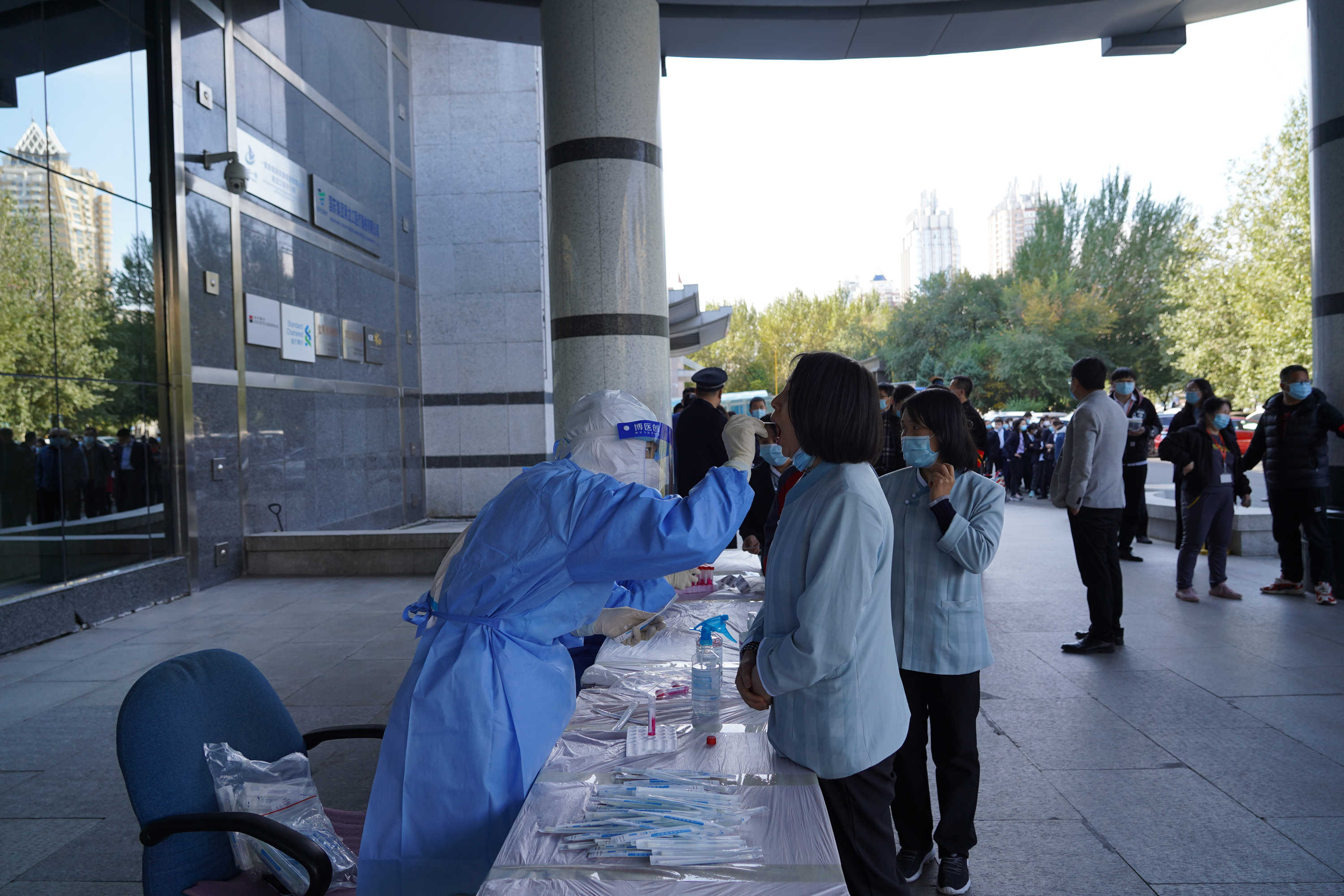 頂圖:國貿大廈項目施工人員有序排隊等待核酸檢測