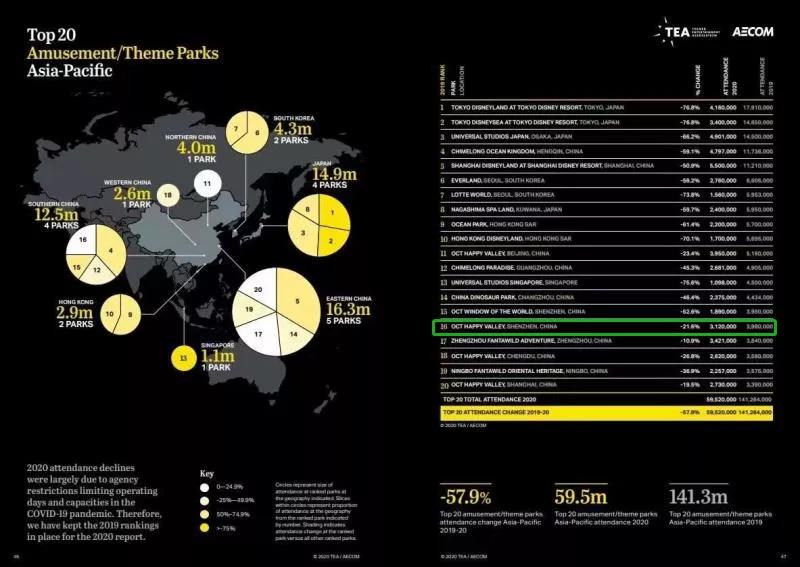 日前,美國主題娛樂協會(TEA)與AECOM經濟諮詢團隊聯合發佈《2020年主題公園和博物館報告:全球主要景點遊客報告》。報告顯示,受全球疫情衝擊,2020年全球主題公園入園人數均出現了較大幅度的下降。得益於中國政府成功的防疫政策和強大的執行力,中國區域恢復情況領跑全球。其中,深圳歡樂谷憑藉硬核的娛樂產品、豐富的節慶活動、靈活的市場策略、精細的運營管理,在最快的時間內重啟疫後市場,經營實現全面復甦,2020年公園接待人數接近2019年的80%,恢復情況領先行業平均水平,全年接待遊客312萬人次,排名躋身亞太地區第8名。