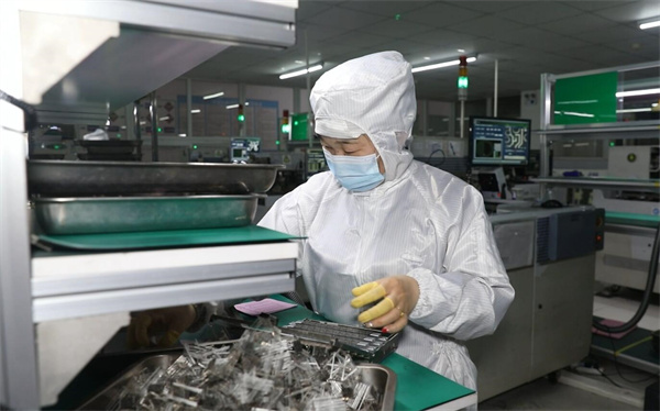 同樣在黃山市廣遠光電科技有限公司,同樣呈現出一派繁忙景象。車間操作工作正在緊張地進行流水作業,140多名工人全部在崗進入滿負荷生產。