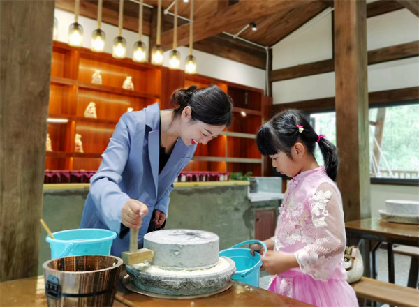 遊客在林夏結廬民宿體驗磨豆腐