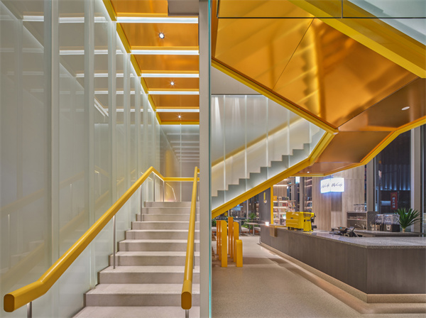 麥當勞中國新總部大樓為獨棟建築,共有八層,與麥當勞經典產品「巨無霸」層數一致,錯落的樓體外觀酷似魔方。「巨無霸魔方MCHQ」 展現了麥當勞全球餐飲行業 「巨無霸」 的領先地位, 「魔方」 般的大樓外觀設計也彰顯了麥當勞年輕潮流、活力創新的形象。室內細節也亮點滿滿,四至八層使用了專屬的主題配色,標誌性的M形樓梯連通核心辦公區域,創造了更多開放協作的空間感。