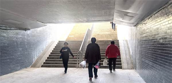 姜大爺滿臉露開心,偶爾見到熟人還主動打起招呼。他高興地說:「就這麼一路之隔,因為這個地下通道設施損毀嚴重,而且環境髒亂差,自己打心裏就不願意從那裏走。」「本來腿腳就不利索,再加上地下通道行路難,我有2、3年沒來街里了。」姜大爺說。
