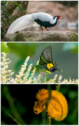 南嶺自然保護區珍惜物種,圖片依次為白鷳、金斑喙鳳蝶、棕鼯鼠