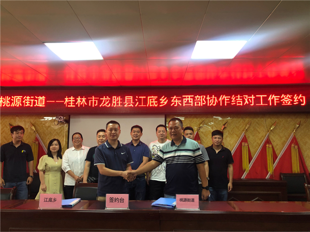 桃源街道-龍勝縣江底鄉結對座談會上,桃源街道與江底鄉簽訂了結對協議。桃源街道黨工委委員伍江鴻表示,江底鄉是一個風景優美的好地方,希望雙方以新一輪粵桂協作為契機,進一步強化溝通協作,弘揚傳承偉大的脫貧攻堅精神,深化鄉村振興協作,推動粵桂協作取得新成就。