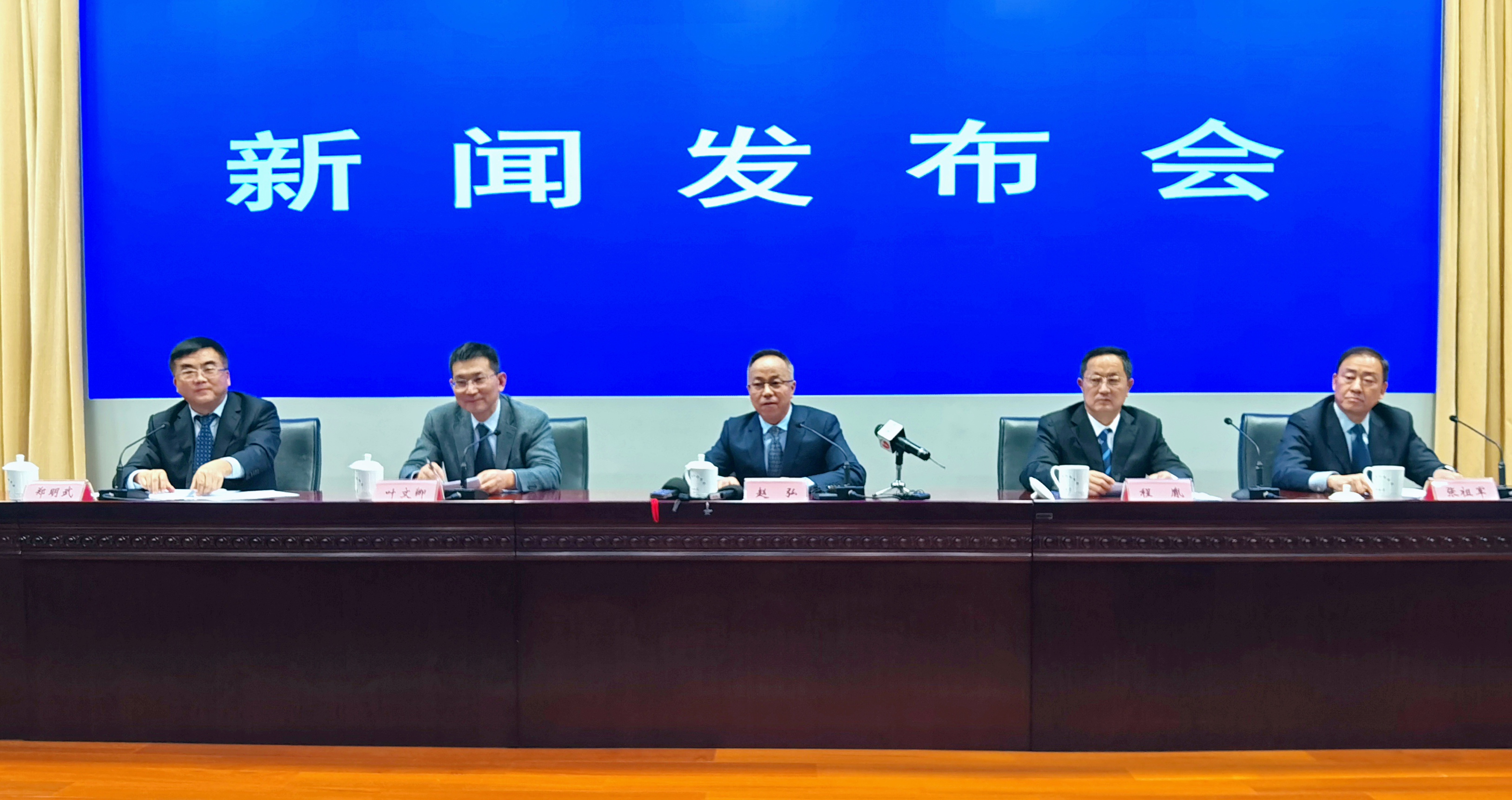新聞發佈會現場,左起:安徽省委宣傳部副部長、省政府新聞辦主任鄭明武主持發佈會,省數據資源局黨組成員、副局長葉文卿,省稅務局黨委委員、總審計師趙弘,省市場監管局黨組成員、副局長張程胤,省公安廳經偵總隊總隊長張祖軍(孫軍/攝)