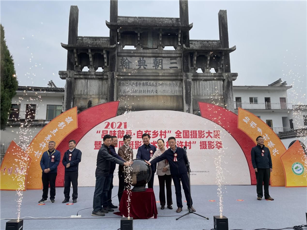 中國攝影家協會主席李舸(左3),安徽黄山市市委常委、政法委書記任生(右3),市政協原副主席胡寧(左2),《中國攝影》雜誌社主編徐豔娟(右2),歙縣縣委書記李忠(右1)按動啟動球。2021“品味歙縣自在鄉村”全國攝影大展暨“中國攝影藝術鄉村·許村”攝影季活動正式啟動。