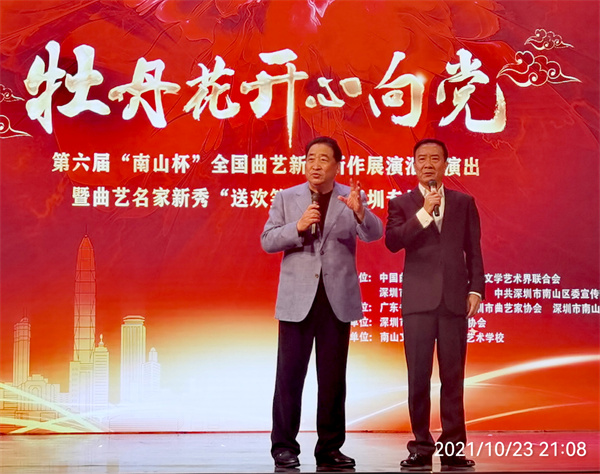 23日晚,「牡丹花開心向黨」第六屆「南山杯」全國曲藝新人新作展演彙報演出暨曲藝名家新秀「送歡笑」走進深圳專場演出在深圳南山成功舉辦。薑昆、戴志誠、翁仁康、楊子春、陳玲玉、劉靚靚、逗笑、逗樂以及參加展演的優秀演員為深圳市民帶來了一場高水準的曲藝專場演出。
