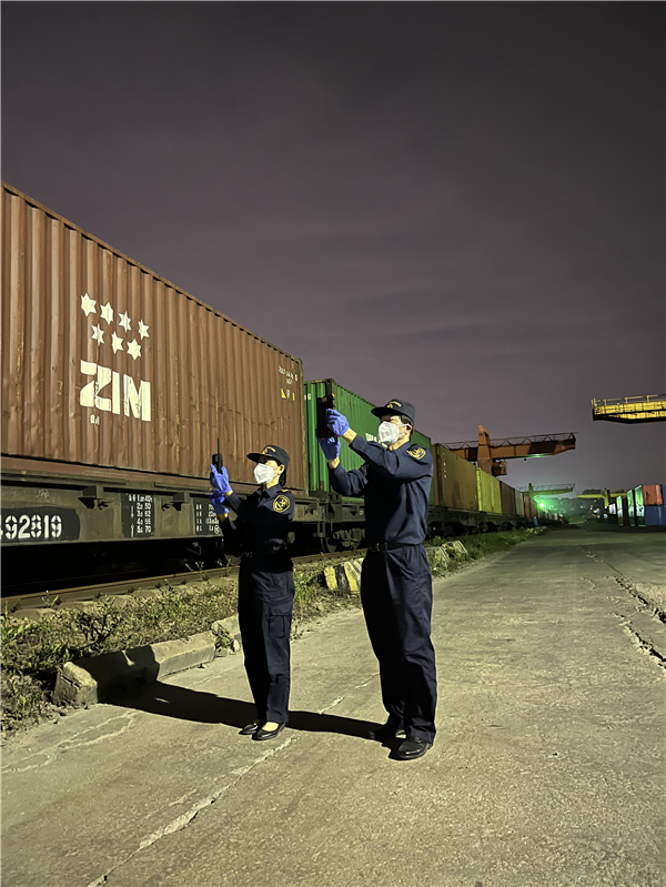廣州車站海關關員深夜監管運抵的「穗新烏」回程中歐班列