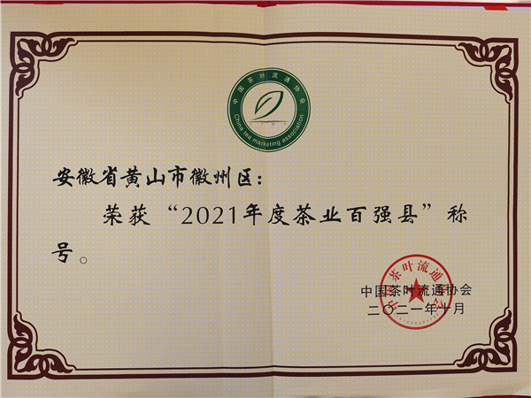 皖南徽州區是黃山毛峰的正宗原產地和核心產區,黃山毛峰茶已成為徽州區的重要支柱產業和標誌性的文化要素。2020年,徽州区全区茶叶总产量2305 吨,茶业综合产值达11.5亿元。10月28日,記者在安徽黃山獲悉:在27日舉行的第十七屆中國茶業經濟年會開幕式暨2021中國茶業品牌盛典上,中國茶葉流通協會發佈了“2021中國茶葉行業年度調查結果”,正式公佈了年度百強企業及百強縣域。徽州區再奪“雙金”:榮獲“2021年度科技興茶富民典型縣域”和“中國茶業百強縣”稱號,其中,“2021年度科技興茶富民典型縣域”為安徽唯一入選區縣。