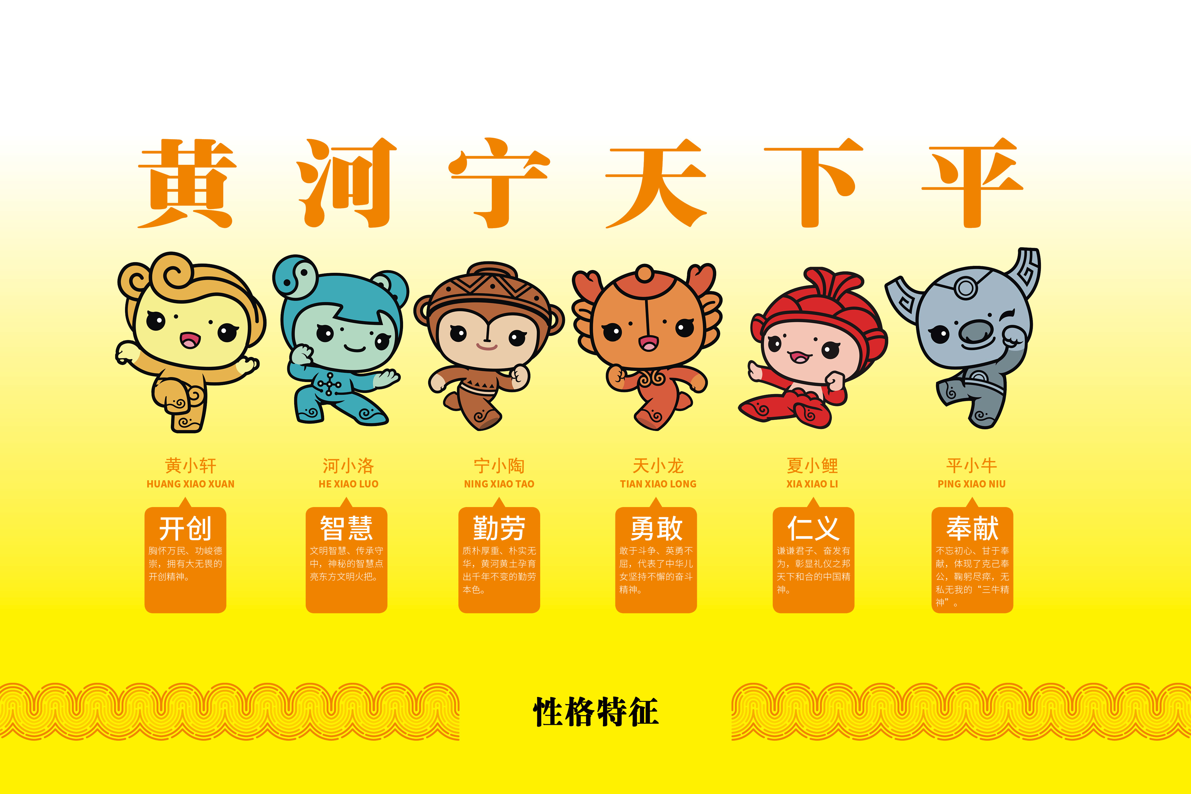 黃河吉祥物由六個分別以「少年軒轅黃帝、少年河洛郎、仰韶彩陶娃、少年黃河龍、黃河鯉魚、鎮河鐵牛」為創意,被親切地叫做「黃小軒、河小洛、寧小陶、天小龍、夏小鯉、平小牛」的「河寶」組成。這組可愛的萌寵天團,與「黃河寧天下平」主題口號相呼應,將向世界生動傳遞黃河流域生態保護和高質量發展的美好願景。