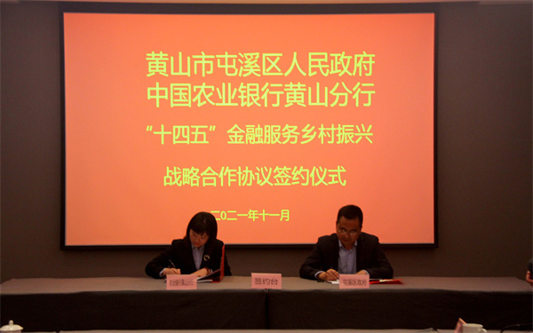 11月1日,安徽黃山市屯溪區人民政府與中國農業銀行黃山分行舉行「十四五」金融服務鄉村振興戰略合作協議簽約儀式,屯溪區委常委、副區長張凡,農行黃山分行黨委委員、副行長丁亮出席簽約儀式。