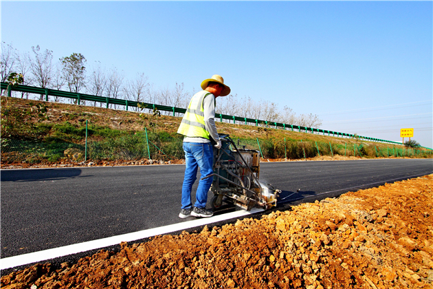 10月29日,在安徽省巢湖市夏閣鎮柳南村劉橋路工程建設現場,剛鋪設好的柏油路面在秋天的田野上顯得十分惹眼,一台挖掘機正在修整路肩,還有工人忙於劃交通線,加緊做好道路工程後期工作。