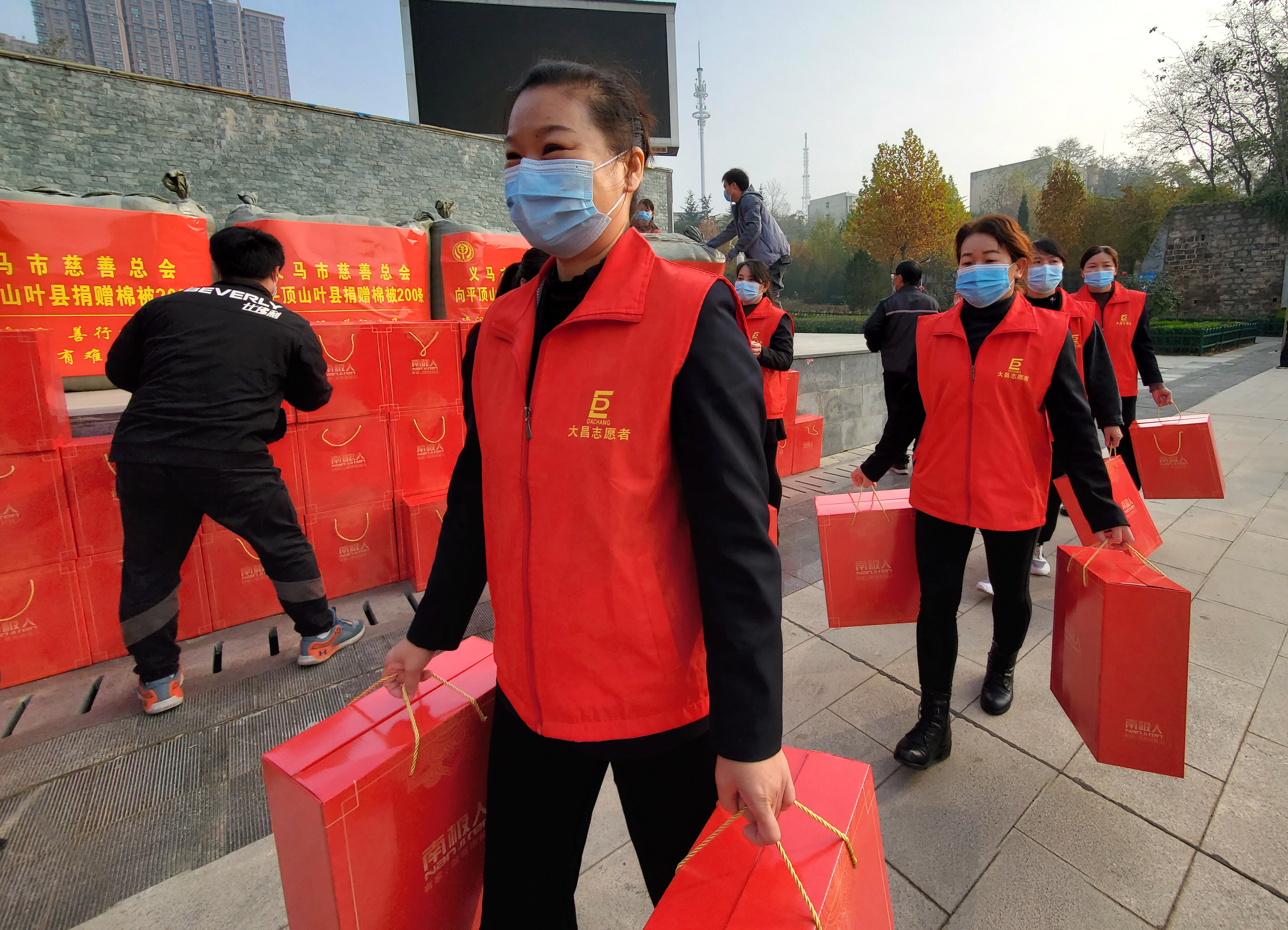 義馬市文明辦、慈善總會、應急管理局、「德耀古驛」志願服務隊及社會愛心人士募集的600餘床愛心棉被,由志願者送往平頂山市葉縣龔店鎮政府,向受災群眾送去冬日裏的溫暖。