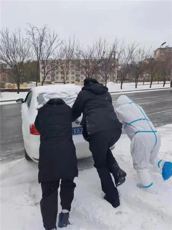 抽調5名警力,與新疆大街派出所對接,承擔三個封控小區的管控任務,開展24小時巡邏值守,維護核酸檢測秩序,開展防疫宣傳,勸阻制止群眾違反疫情防控公告的行為等。11月8日,天降小雪,路面結冰。8時許,小區一名癌症患者需要到醫院做放療治療,途中車輛打滑無法行進,民警立即幫助推車,令患者家屬十分感動。