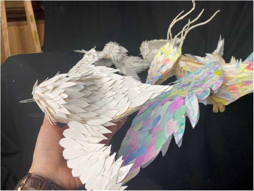展覽現場另一件宏大體量的作品是大型紙雕裝置《鳥集鱗萃》。惟妙惟肖的鳥群從牆壁上的紙雕森林中掙脫而出,展翅飛翔在展廳半空,這件作品是由沈彤和小燕畫院·巢老師馬艷合作完成的,鳥群的每一根羽毛都是沈彤用紙一點點剪出來的。馬艷告訴記者,最初只想做一隻鳥的飛行軌跡,再拍成動畫作品,經過半年的不斷修改,變成了如今群鳥翱翔的大型裝置。