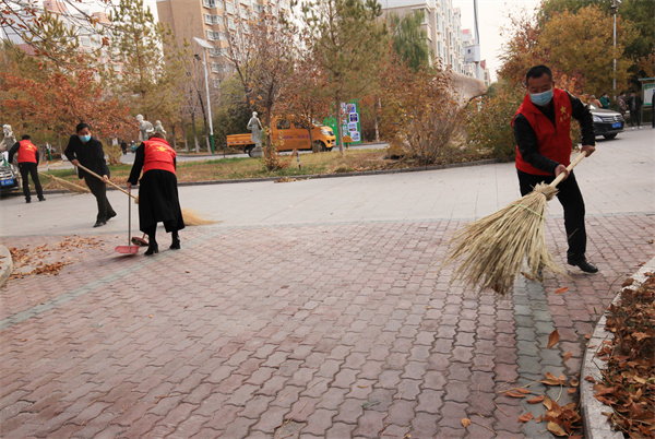 雙河市政公司第一黨支部黨員志願者清掃小區里的樹葉