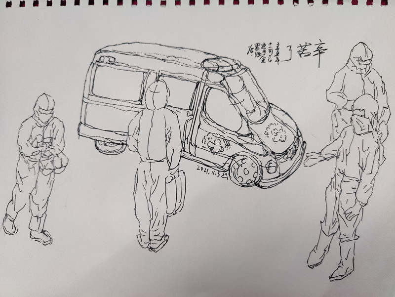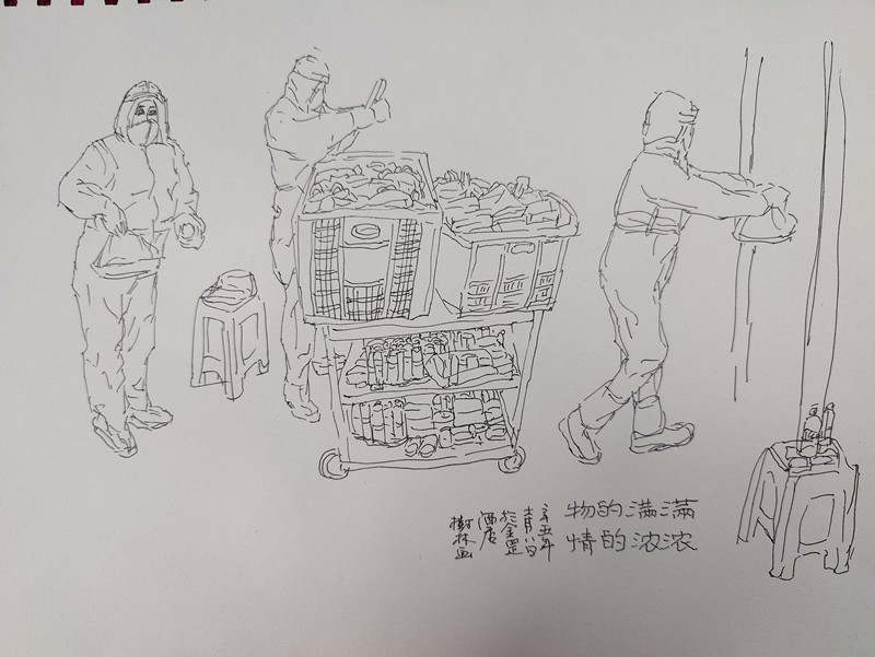 這組速寫畫共有10幅,故事從秦樹林入住隔離酒店開始,在他的畫中,從隔離酒店的醫務人員測核酸、送餐人員按時送餐、垃圾清運人員清理垃圾、綜合協調工作人員及時保障生活必需品,每一個人都在自己的崗位上堅守並忙碌着,都是該隔離酒店工作人員的真實寫照。
