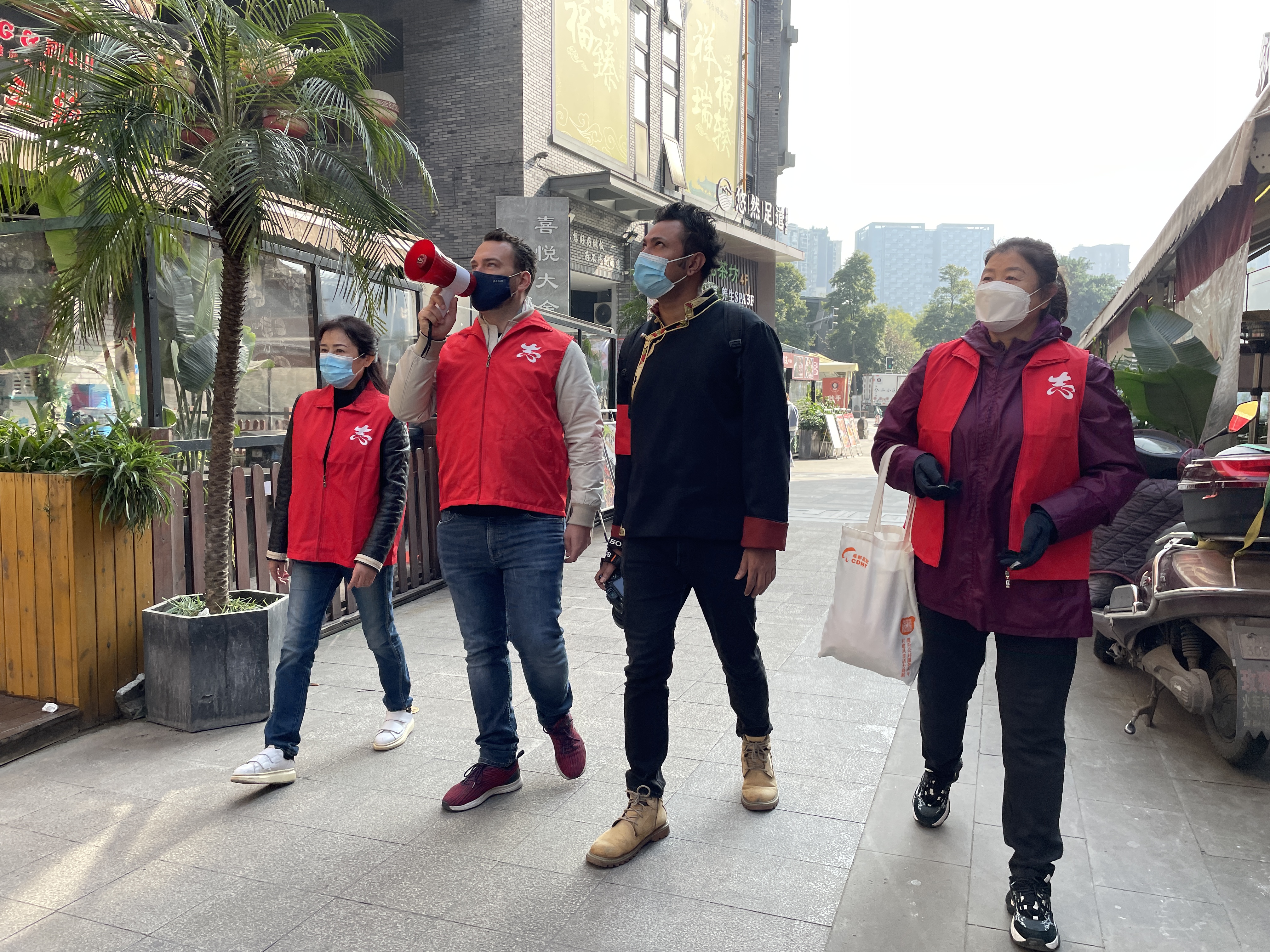 在盛華社區鐵像寺水街門崗處,來自德國的志願者克里斯身穿志願者紅馬甲,配合社區工作人員、一線網格員,對來往居民進行亮碼測溫的服務,克里斯對待工作認真負責,沒有絲毫鬆懈;一旁來自尼泊爾的阿瑪是一名自由職業攝影師,他通過照相機記錄下抗疫一線的精彩瞬間,並把拍攝的照片分享到社交網絡上,讓更多人了解成都抗疫的真實故事。