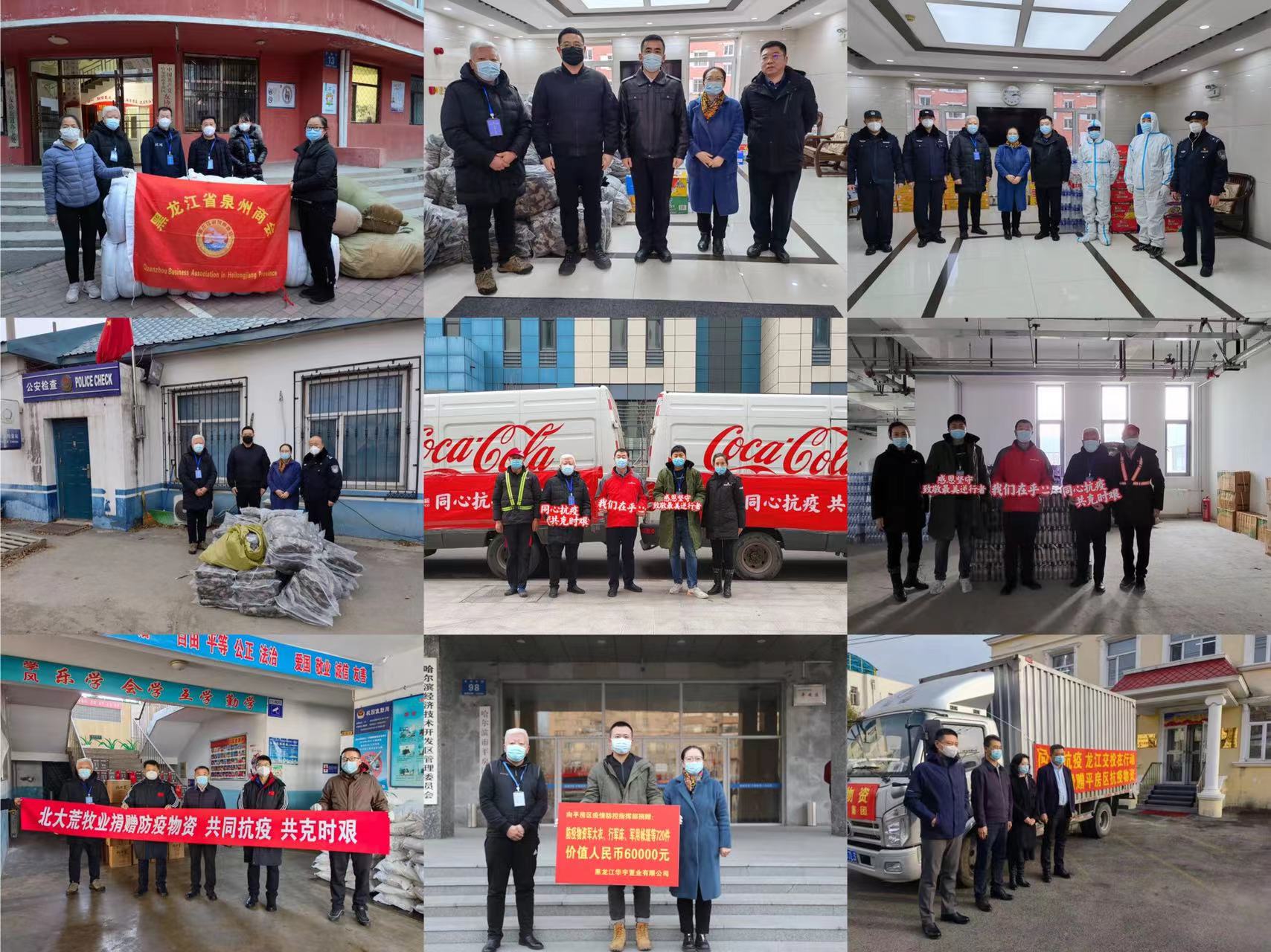 哈爾濱英才快餐食品有限公司、泉州商會、哈爾濱珍寶製藥有限公司、北大荒豆業、中糧可口可樂、八達集團、東鵬飲料(集團)股份有限公司、哈爾濱龍之潤科技有限公司、比優特商貿有限公司、黑龍江珍選食品有限公司、航天科技控股集團股份有限公司、哈爾濱雙匯北大荒食品有限公司、萬宇科技、金龍物流運輸有限公司、哈爾濱天海電子有限公司、黑龍江釜隆瑞鑫精工科技公司、哈爾濱實力航空工業有限公司、哈爾濱哈飛工業有限責任公司、哈爾濱東安進出口有限公司、哈爾濱東大高新材料股份有限公司、哈爾濱東盛金材科技股份有限公司、黑龍江太氏食品有限責任公司、哈爾濱中飛新技術股份有限公司、威瀚電氣、哈爾濱華春藥化環保技術開發有限公司、哈爾濱瀚霖科技開發有限公司、廣聯航空工業股份有限公司、對青烤鵝、哈爾濱人人好醫藥連鎖有限公司、哈爾濱聖昌科技開發有限公司、黑龍江龍江福糧油有限公司、北大荒牧業、紅海人力集團、哈爾濱小酒喔倉儲有限公司、哈爾濱龍濱實業有限公司、黑龍江鑫達企業集團有限公司、黑龍江省恒生幹細胞工程有限公司、哈爾濱艾瑞排放控制技術股份有限公司、哈爾濱健康醫藥連鎖有限公司、正陽家園、哈爾濱紅旗茂商業城有限責任公司、黑龍江煦航企業財稅管理諮詢有限公司、黑龍江正開律師事務所、黑龍江電力建設監理有限責任公司、哈爾濱頂益食品有限公司、黑龍江華宇置業有限公司、哈爾濱安宇迪航空公司、黑龍江王氏國信城網絡股份有限公司、哈爾濱老哈食品有限公司、哈爾濱深哈投資管理有限公司、黑龍江大三源乳品機械有限公司、哈爾濱秋林飲料科技股份有限公司、香港商報黑龍江辦事處等企業紛紛以捐款、捐物等形式助力疫情防控。