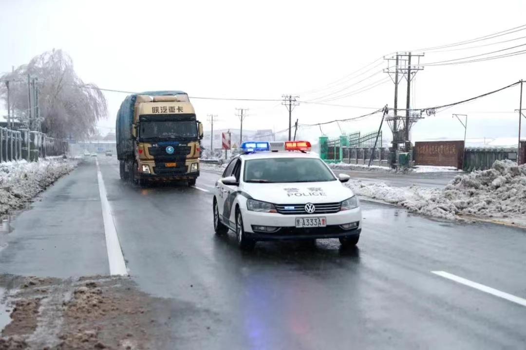 由於強降雪天氣影響,哈同高速、鶴哈高速陸續被封閉,國省道道路通行條件複雜。為保障民生物資、防疫物資的順利送達,冰城公安交警部門及時啟動應急預案,一方面採取「斷續放行」方式,疏導在高速公路、服務區、國省道停留的貨運車輛;另一方面,以警車帶道,保障拉載糧食、果蔬、生鮮等物資的車輛安全出行。路面執勤警力變身為市民生活物資的「保障員」。