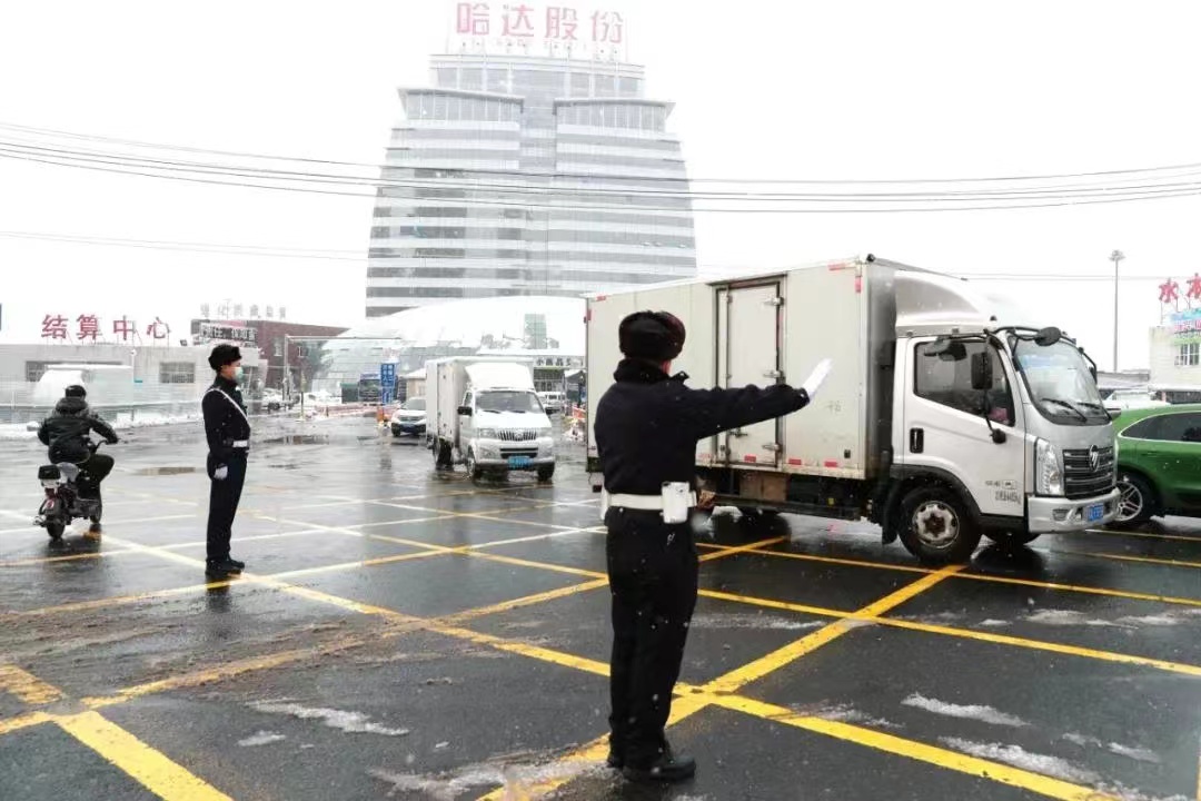 10日11時許,道里區迎來降雪,為保障民生物資車輛順利通行,道里大隊派出警力來到一面街和友誼路交口處,對進出哈達市場的貨運車輛實時疏導,並對停在門口黃色網格線內的車輛進行了清理,提升了路口通行效率。