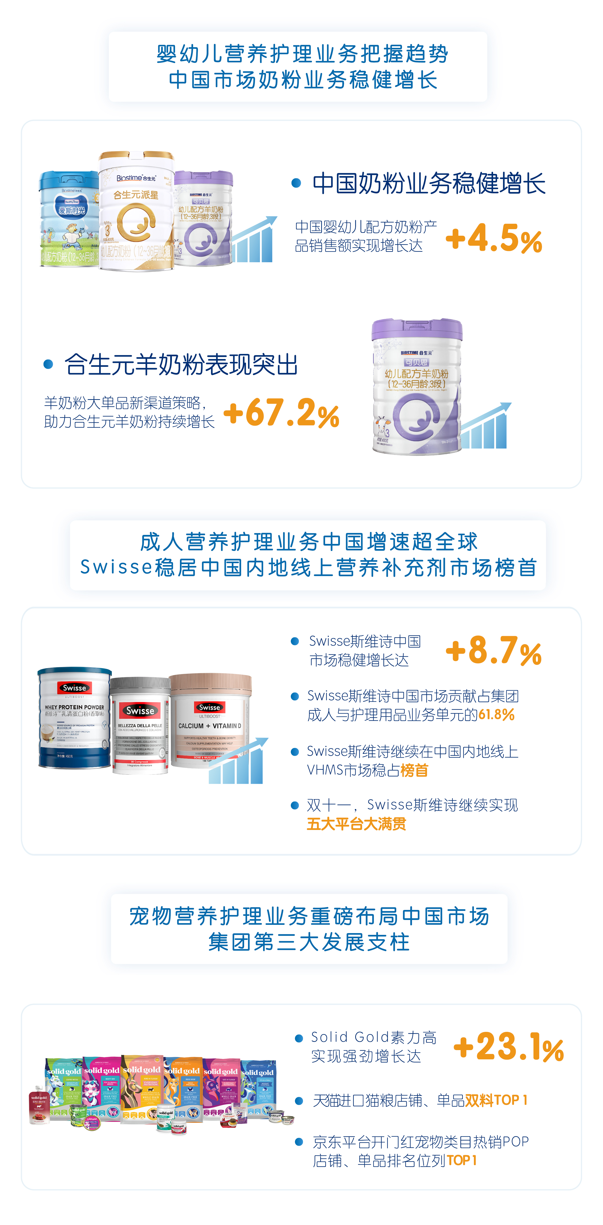 目前,健合集團旗下分別有嬰幼兒、成人、寵物三大業務板塊。其中,嬰幼兒營養及護理用品業務單元(BNC)中的中國市場奶粉業務銷售額實現4.5%增長;成人營養及護理用品業務單元(ANC)銷售額全球升勢明顯,達5.8%,其中ANC中國市場增幅達8.7%;寵物營養及護理用品業務單元(PNC)營收達3.45億元,Solid Gold素力高同比增長達23.1%,PNC中國市場在PNC業務單元占比41.1%。