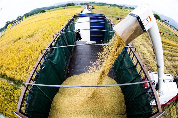 16日,記者走進廣州增城區朱村萬畝農業現代化示範區的科旺絲苗米種植基地,看到田間的水稻長勢喜人,沉甸甸的稻穗壓彎了稻稈,空氣里瀰漫着淡淡的稻香。遠處兩台大型收割機在稻田裏來回穿梭,轟隆隆的聲音響徹整片稻田,飽滿的稻穗不斷湧入機器,不到半個小時,一畝稻穀就被收割完成。據廣州科旺實業有限責任公司負責人介紹,今年科旺絲苗米種植基地種植了3300多畝絲苗米,平均畝產約為700斤,預計需一個月時間完成水稻收割。