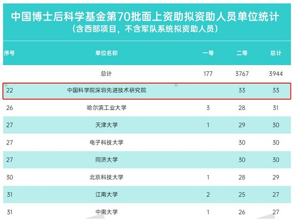 近日,中國博士後科學基金會正式公示2021年下半年70批次中國博士後科學基金項目擬資助人員名單。據第三方機構「青塔」統計,中國科學院深圳先進技術研究院博士後共獲資助33項,資助金額264萬元,位居全國第22位、連續五年蟬聯全國科研院所第一。在上半年69批面上資助共計獲批46人,資助金額442萬元,獲批人數居全國科研院所第一,全國排名第20名,廣東省排名第4名;本年度總獲批79人,成績再創新高,體現了深圳先進院博士後培養體系的優勢與實力。