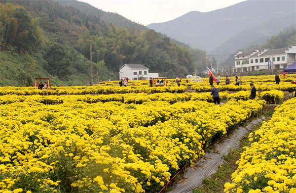 在隆興坳村黃菊基地,一簇簇皇菊組成黃色花海,美不勝收,遊客漫步在菊花叢中拍照記錄美好。菊花基地負責人盧偉透露,鮮菊花干菊花都開發了系列產品,該處黃菊基地已為附近30多名村民提供就業崗位。