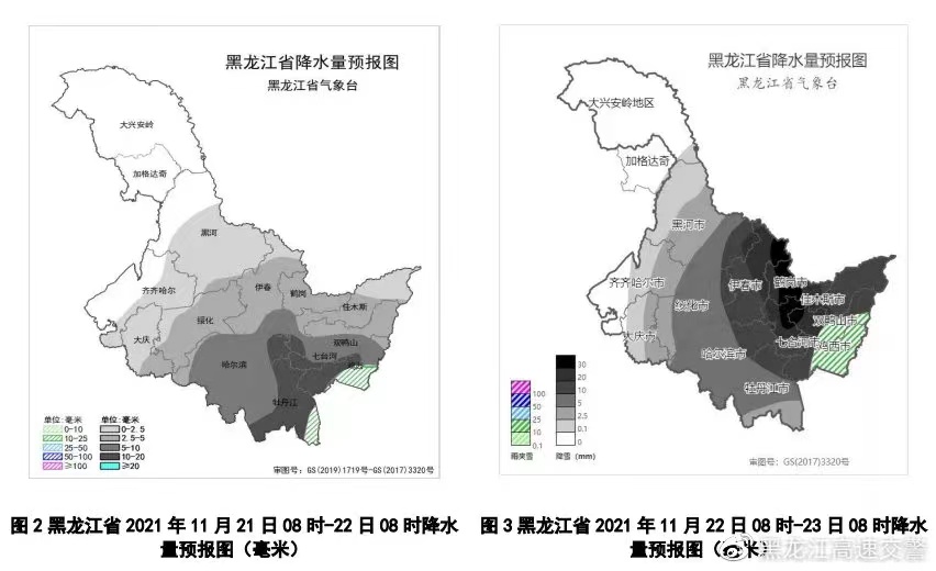 11月21-23日黑龍江省有一次大範圍雨雪、大風天氣過程,主要降水時段在21日夜間至22日夜間,伊春北部、哈爾濱東北部、鶴崗、佳木斯西部、雙鴨山西部、七台河、雞西西部、牡丹江北部累計降水量為25~35毫米,其中哈爾濱東北部、鶴崗西部、佳木斯西部、雙鴨山西部、七台河局地可達35~45毫米;大興安嶺、黑河西部、齊齊哈爾1~8毫米,其它地區10~20毫米。