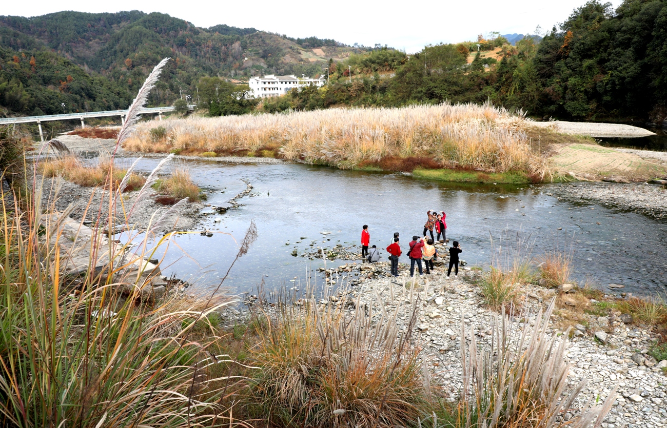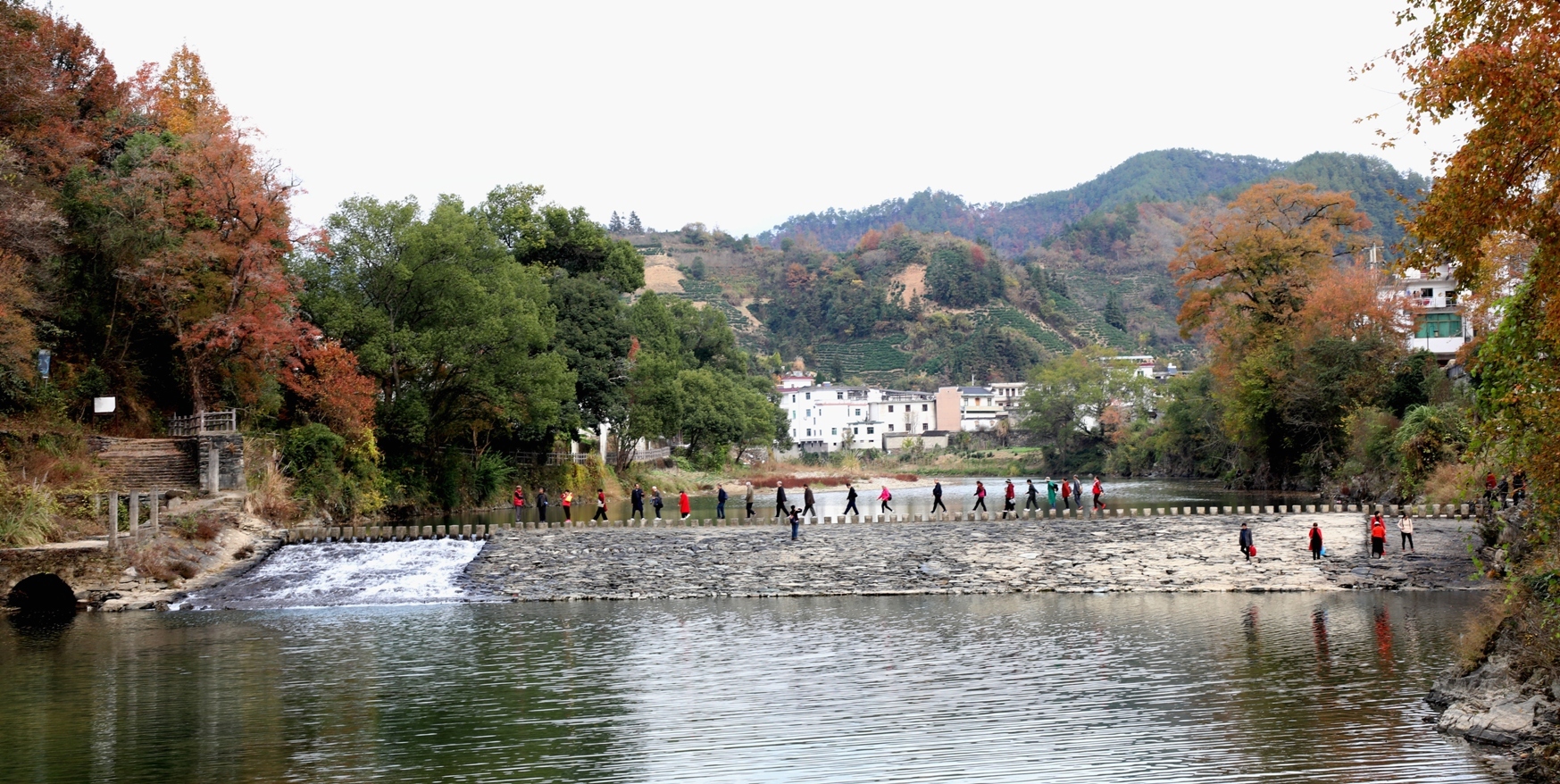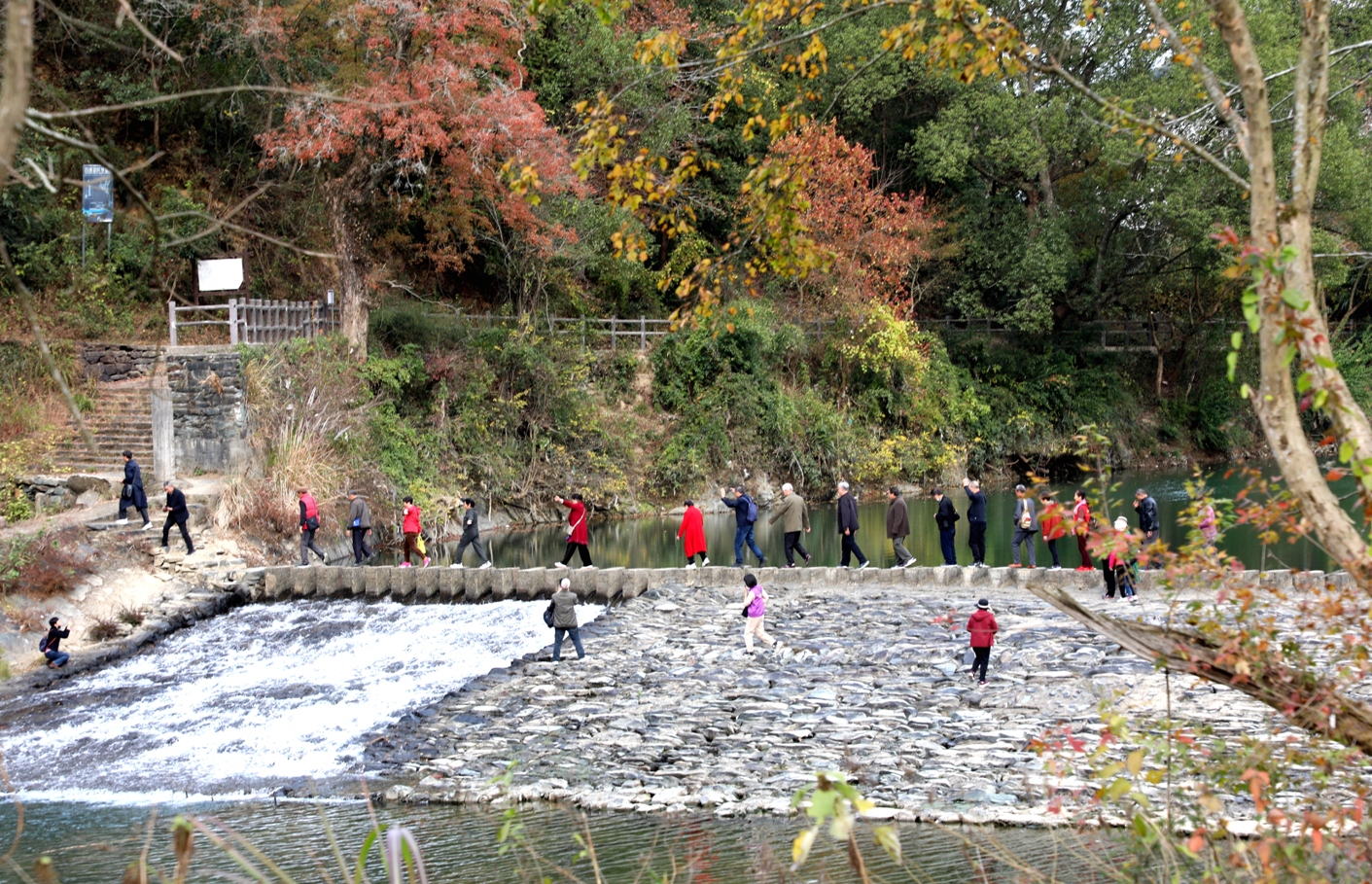 11月20日,安徽歙縣昌溪鄉昌溪村村口處秋色正濃,遊客成群結對觀美景賞秋色,尋找美麗放飛心情。
