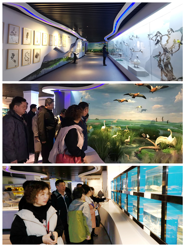 鄱陽湖水文生態展示廳中,展示科普了鄱陽湖豐水、枯水、平水等不同時期的水文特徵,還通過實體生物標本及多媒體手段,生動再現了鄱陽湖中鳥類、魚類、浮遊動物、水生植物、藻類、底棲動物等多樣的水生物種。中華鱘、長江江豚、胭脂魚、天鵝、白鶴……一個個生動珍稀的水生物標本,讓觀察團一行連連感嘆鄱陽湖生態物種的豐富和多樣。