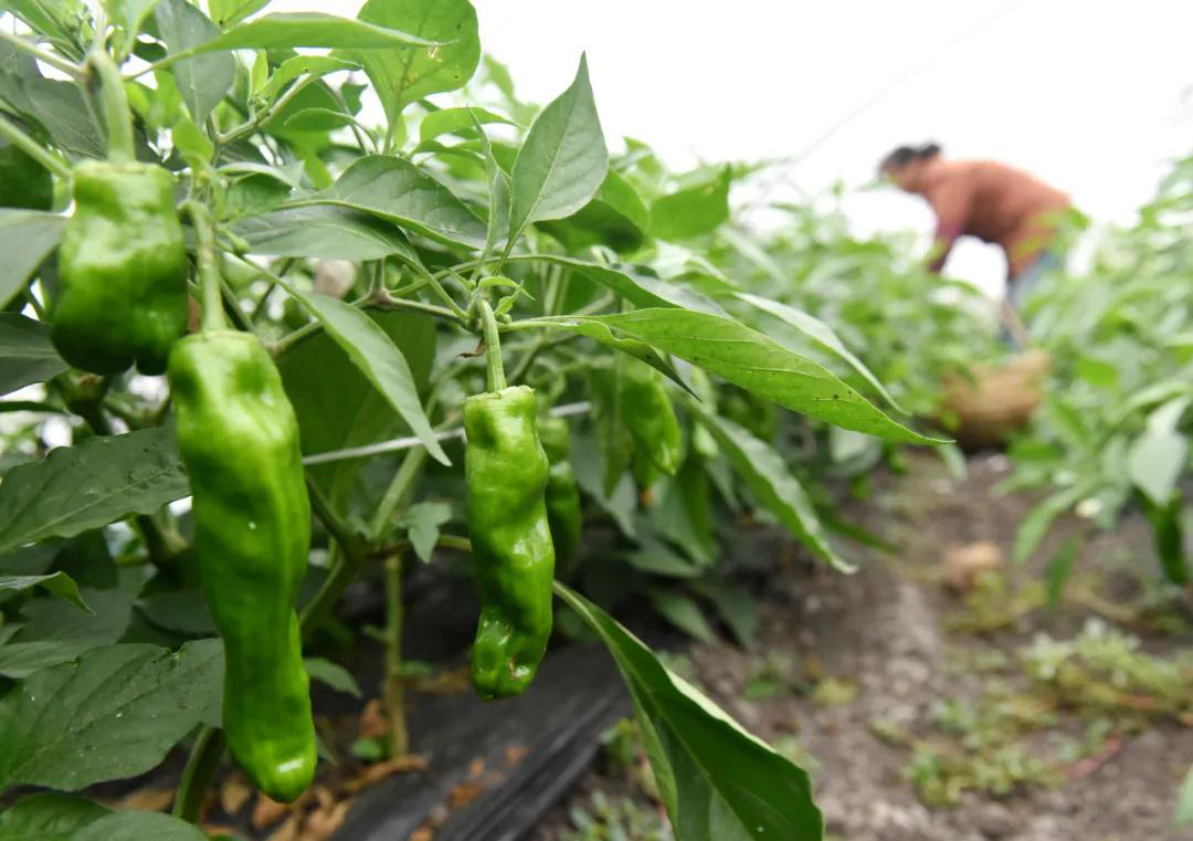 11月21日一大早,我們來到中垾鎮業銀家庭農場,一排排標準鋼架大棚整齊排列。走進大棚,裏面一片綠意盎然。只見一個個色澤飽滿的辣椒掛在枝頭,農戶們穿梭其間,手腳麻利地採摘辣椒,臉上寫滿了豐收的喜悅。「採摘辣椒時,注意不要將辣椒枝條弄斷、小心別碰到辣椒花……」農場負責人謝嶸一邊忙着說,一邊親自示範。在她的指導下,農戶們採摘辣椒都格外小心。