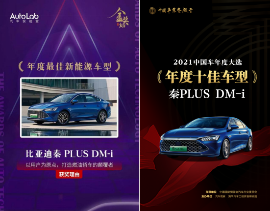 近期,比亞迪秦PLUS DM-i捷報頻傳,繼榮獲「中國心」2021年度十佳新能源汽車動力系統後,又先後斬獲了「年度最佳新能源車型」和2021中國車年度大選「年度十佳車型」兩項大獎。