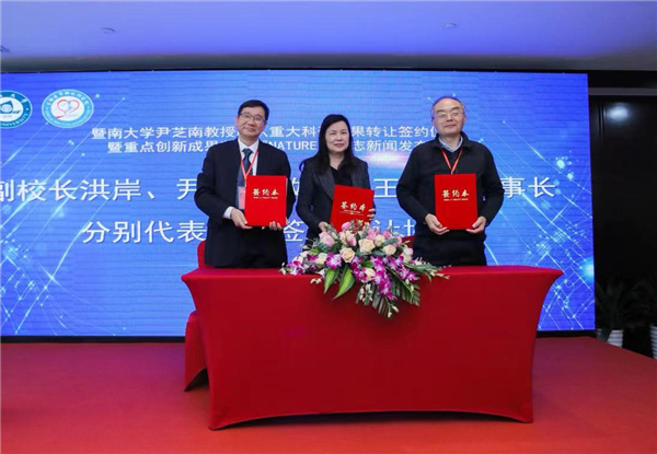 發佈會上,暨南大學與廣東暨德康民生物科技有限責任公司,就尹芝南教授團隊的另一科研成果「同種異體Vγ9Vδ2-T細胞免疫療法」簽署成果轉讓協議。暨德康民技術團隊在公司創始人及首席科學家尹芝南教授的帶領下取得了一系列關於 Vγ9Vδ2-T 細胞臨床應用的核心技術成果,已在高水平國際知名學術期刊發表多篇臨床研究成果。同時核心技術已經申請了中國專利和多個國際專利。暨德團隊目前與廣州、深圳、珠海、武漢、上海等多家三甲醫院合作開展異體Vγ9Vδ2-T細胞治療惡性腫瘤的臨床研究,同時積極參與行業標準制定,已經成為國際異體Vγ9Vδ2-T細胞免疫治療方向的引領者之一。