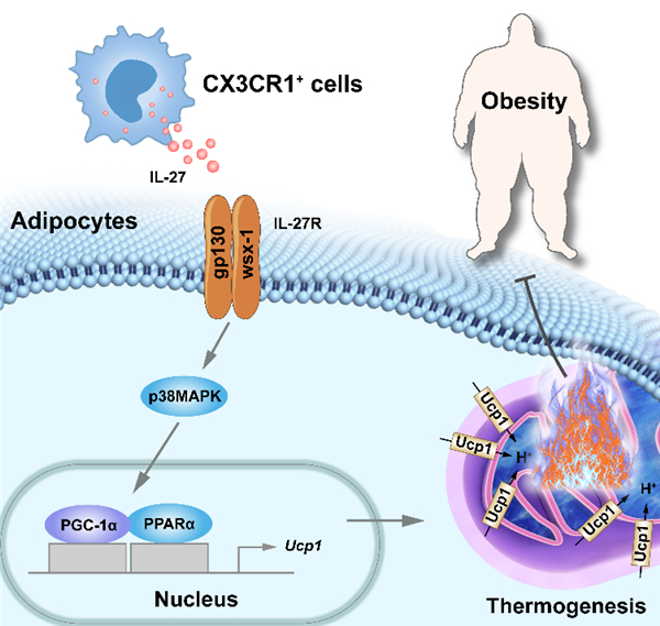 該論文中,研究人員通過構建多種基因工程小鼠,進行高脂飲食誘導的肥胖模型,並結合肥胖人群樣本發現,肥胖人群血清中白細胞介素27(IL-27)水平下降,突破了傳統觀念中白細胞介素IL-27專一性靶向免疫細胞的認知,首次發現IL-27通過直接作用於脂肪細胞,導致白色脂肪細胞棕色化,並激活UCP1介導的「脂肪燃燒」,通過將脂肪組織中的脂質轉變為熱量消耗掉,從而達到降低體重和改善糖尿病等代謝性疾病的目的。