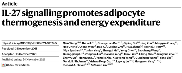 《Nature》雜誌在線發表的「IL-27 signaling promotes adipocyte thermogenesis and energy expenditure」論文截圖