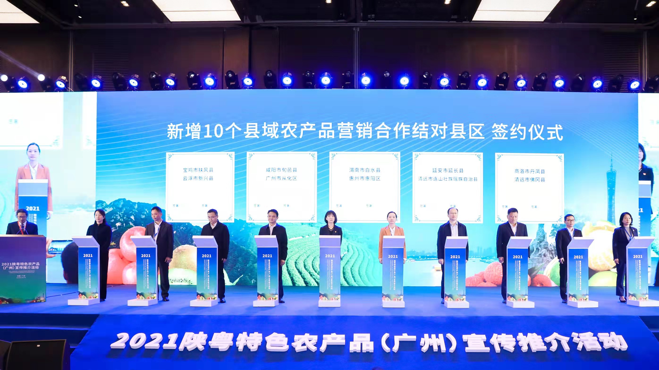 11月27日,陝粵特色農產品(廣州)宣傳推介活動在廣州市舉行。活動現場,陝西寶雞市扶風縣和廣東雲浮市新興縣等10個縣區現場簽約結對,陝粵兩省縣域農產品營銷結對縣區增至30個,實現了兩地更廣範圍、更寬領域的合作。同時進行了陝西蘋果與廣東柑橘「1+1」聯名認養產品發布,繼蘋果和荔枝後,兩地最有代表、最具影響的特色農產品,再次聯手共拓市場,兩省特色農產品銷售合作漸入佳境。