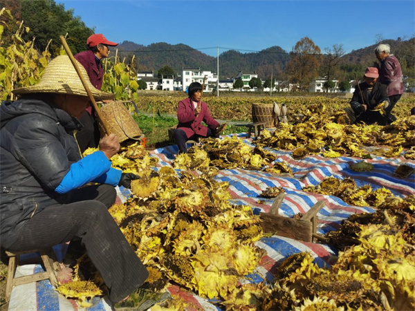 連日來,安徽黄山市徽州區蜀源村百畝葵花陸續成熟進入豐收季。數十名村民忙著收割、晾曬,在忙碌中盤點著收穫。