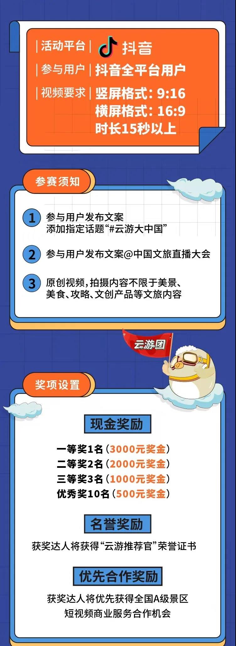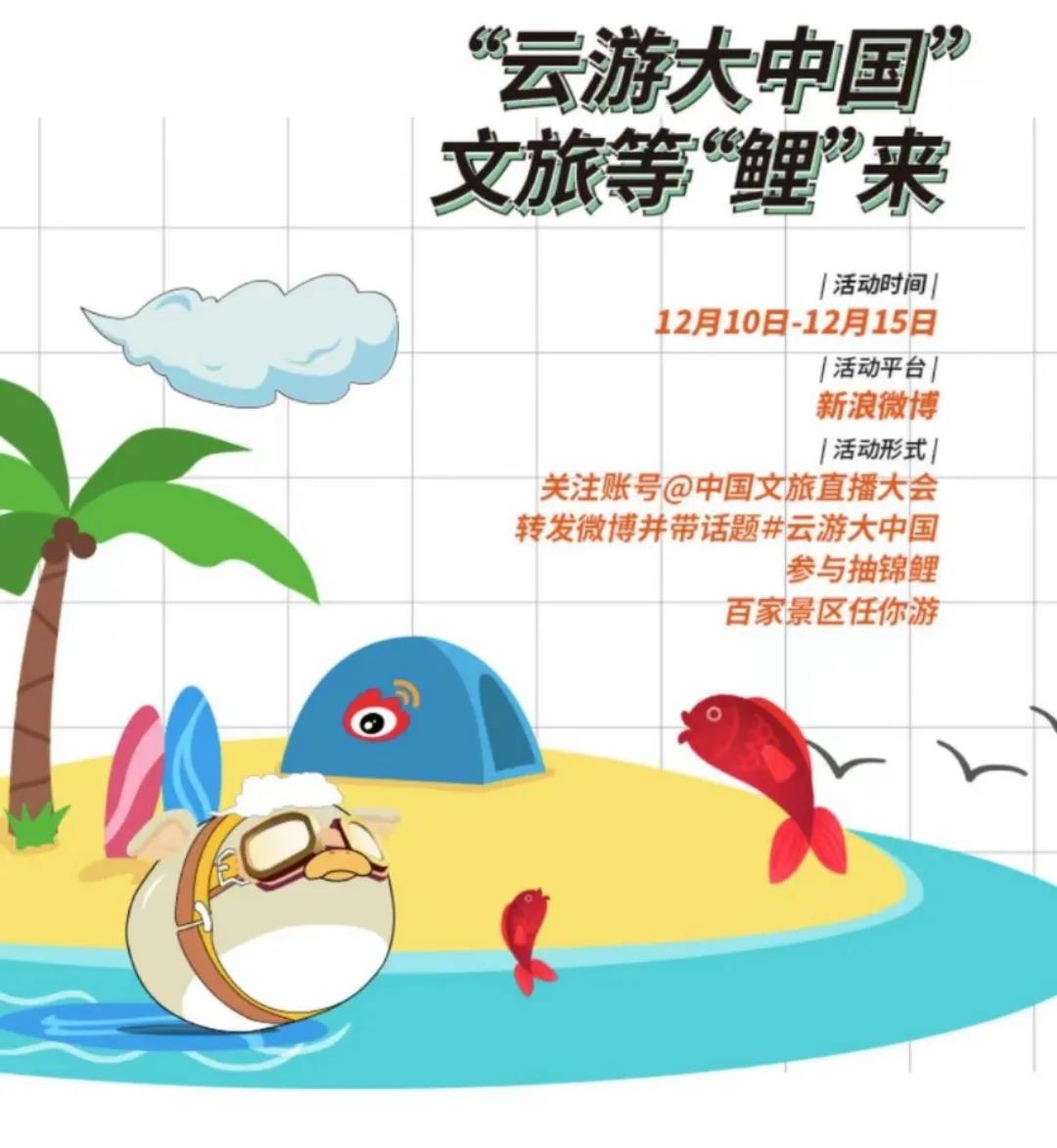 (二)12月10日至15日,大會將於微博平臺開展“雲遊大中國 文旅等鯉來”話題抽獎,關注帳號並@“中國文旅直播大會”,帶話題“#雲遊大中國#”轉發微博即可參與抽獎,全國百家景區任你遊!
