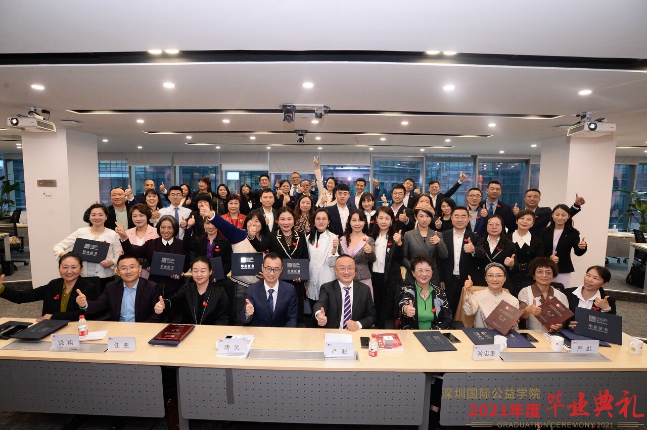 12月10日,深圳國際公益學院(以下簡稱公益學院)2021年度畢業典禮在北京和深圳兩地線上線下同時舉行,GPL全球善財領導力項目21位同學,EMP國際慈善管理99位同學,正式畢業。公益學院董事會主席馬蔚華、董事陳越光、院長嚴駿、副院長黃浩明及公益學院客座教授李勁、中國社會企業與影響力投資論壇總裁馬翔宇等學院領導、老師及嘉賓出席。本次典禮由公益學院公益管理教育中心主任劉冰華,公益管理教育中心學術主任唐昊主持。