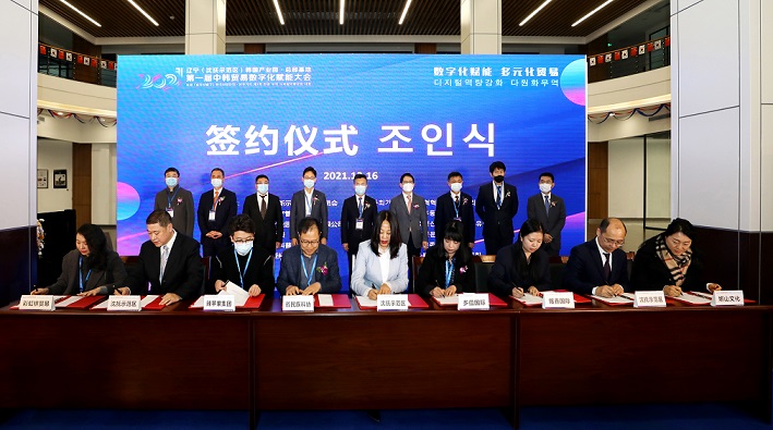 時值年終歲尾,瀋撫示範區對外開放工作依然馬不停蹄,在遼瀋大地掀起了一陣數字經濟合作的新「韓」潮。12月16日,遼寧(瀋撫示範區)韓國產業園·總部基地第一屆中韓貿易數碼化賦能大會舉行,瀋撫示範區彩虹橋國際貿易平台等6個項目簽約落戶,來自中韓政界、學界、商界的代表就加強數字經濟賦能對接、加快互聯互通合作、密切人文交流等方面展開交流、建言獻策,推動示範區對外開放平台建設邁上新台階、實現新跨越、開啟新篇章。
