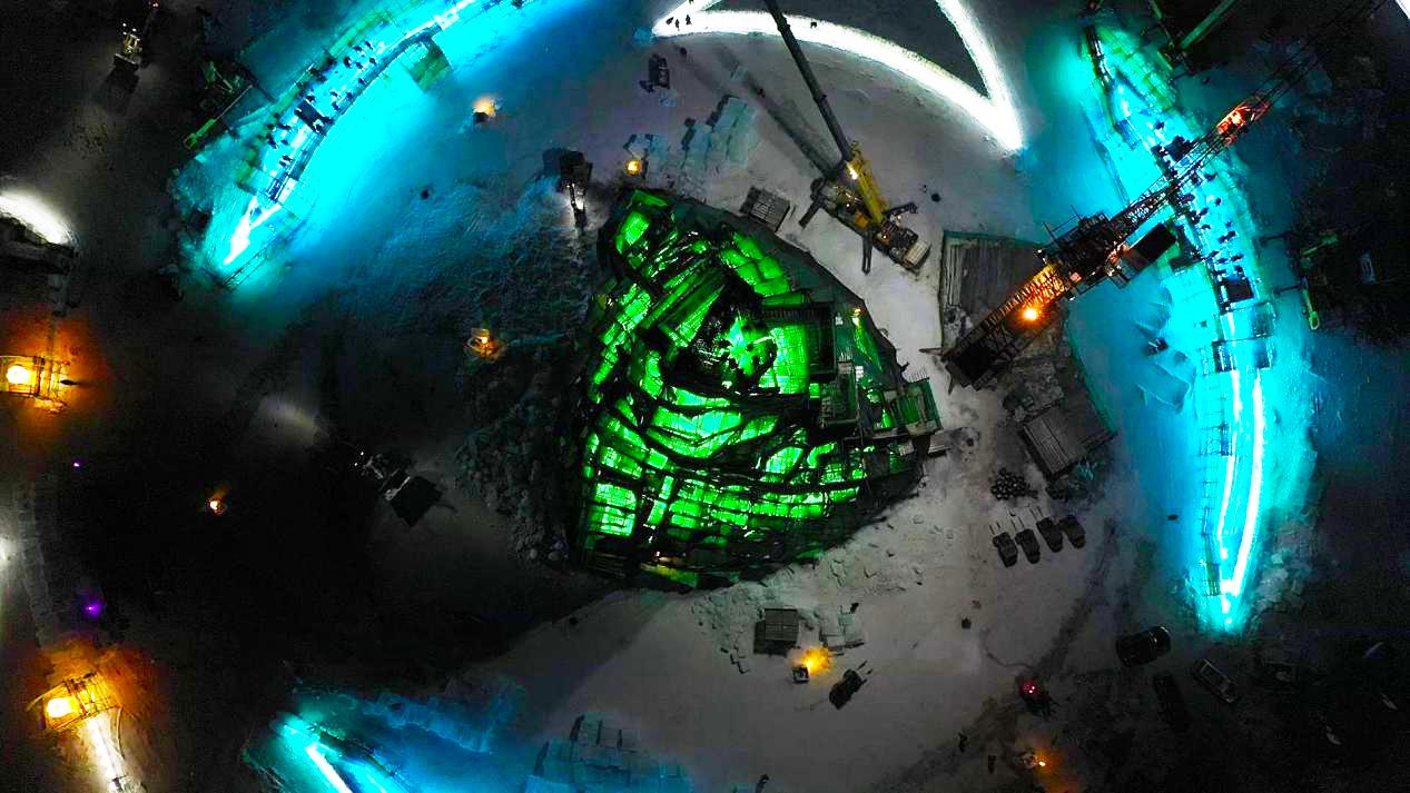 12月18日晚11時17分,第二十三屆哈爾濱冰雪大世界園區主塔「聖火之巔」搭建上最後一塊冰。這標誌着主塔的封頂工作正式完成,「聖火之巔」已進入最後的細節打磨和燈光調試階段。