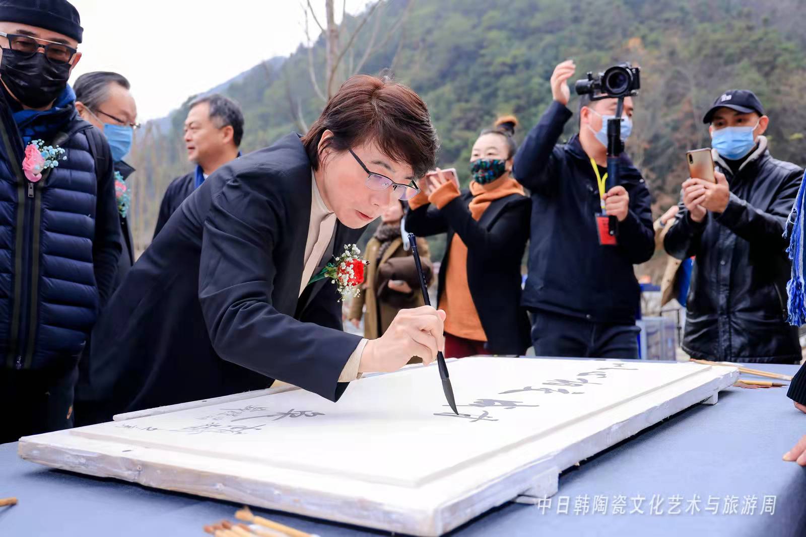 旅日藝術家熊峰出席中日韓陶瓷文化藝術與旅遊周藝術特展活動時題詞:以心相交,成其久遠