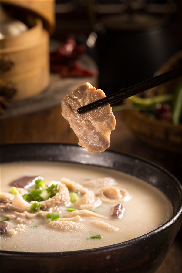 事實上,羊肉湯一年四季都被好吃嘴惦記着。一碗熱氣騰騰的羊肉湯,可以開啟幸福的一天。清早起床,找一家街邊小店,老闆穿梭在狹窄的空間裏,大聲喊着「小心燙哦」,不一會,一大鍋羊肉湯就粗狂地擺在桌上了。叫上一碗羊肉,伴着濃湯,蘸着辣椒麵,美美下肚,這是過去簡陽羊肉湯最傳統的吃法。現如今,簡陽羊肉湯在原有基礎上,已研製出羊肉香腸、風乾羊肉、泡椒羊蹄、醃羊耳、盒裝羊肉湯等上百種羊肉菜品和獨具特色的羊肉全席。
