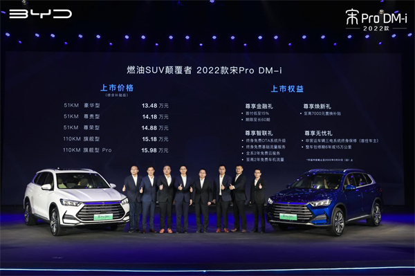 12月22日,2022款宋Pro DM-i正式上市,官方指導價(綜合補貼後)13.48萬元—15.98萬元。定位「燃油SUV顛覆者」,2022款宋Pro DM-i帶來五大煥新——新動力、新外觀、新內飾、新智能、新操控,不僅滿足了中國家庭用戶對一台SUV的所有期待,也重新定義了15萬級SUV的新價值。