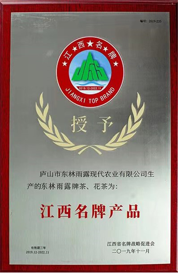 12月26日,在江西省農業農村廳、中國茶產業聯盟指導下,由江西省茶產業聯合會主辦的2021首屆“贛茶杯”全省綠色生態有機茶產品質量評比頒獎活動圓滿落幕。經專家評審並綜合評定,由廬山市東林雨露現代農業有限公司選送的 “東林雨露”牌廬山雲霧茶獲得綠茶組“金獎”。