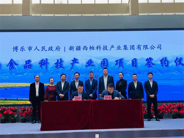 在自治州黨委常委蘇卡,博樂市黨委書記、賽里木湖風景名勝區黨工委書記李海軍,博樂市黨委副書記朱紅兵,博樂市黨委常委馬那提別克,西帕集團董事長許志學,副董事長劉彩霞的見證下, 自治州副州長、湖北援疆工作前方指揮部副總指揮方向榮和西帕集團首席戰略官劉敬文簽署了全面戰略合作協議,博樂市副市長黃連軍和西帕食品總經理李澤簽署了西帕食品科技產業園投資協議。(記者 翁海倩 攝影哈力·瓦里汗)