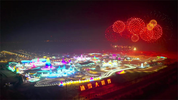 跨年夜上演煙花秀是哈爾濱冰雪大世界的傳統,來冰雪大世界看煙花秀,也成為了很多哈爾濱人必不可少的跨年慶祝活動。煙花升空絢麗綻放的瞬間,與流光溢彩的冰燈共同照亮冰雪大世界的夜空,整個園區美不勝收。